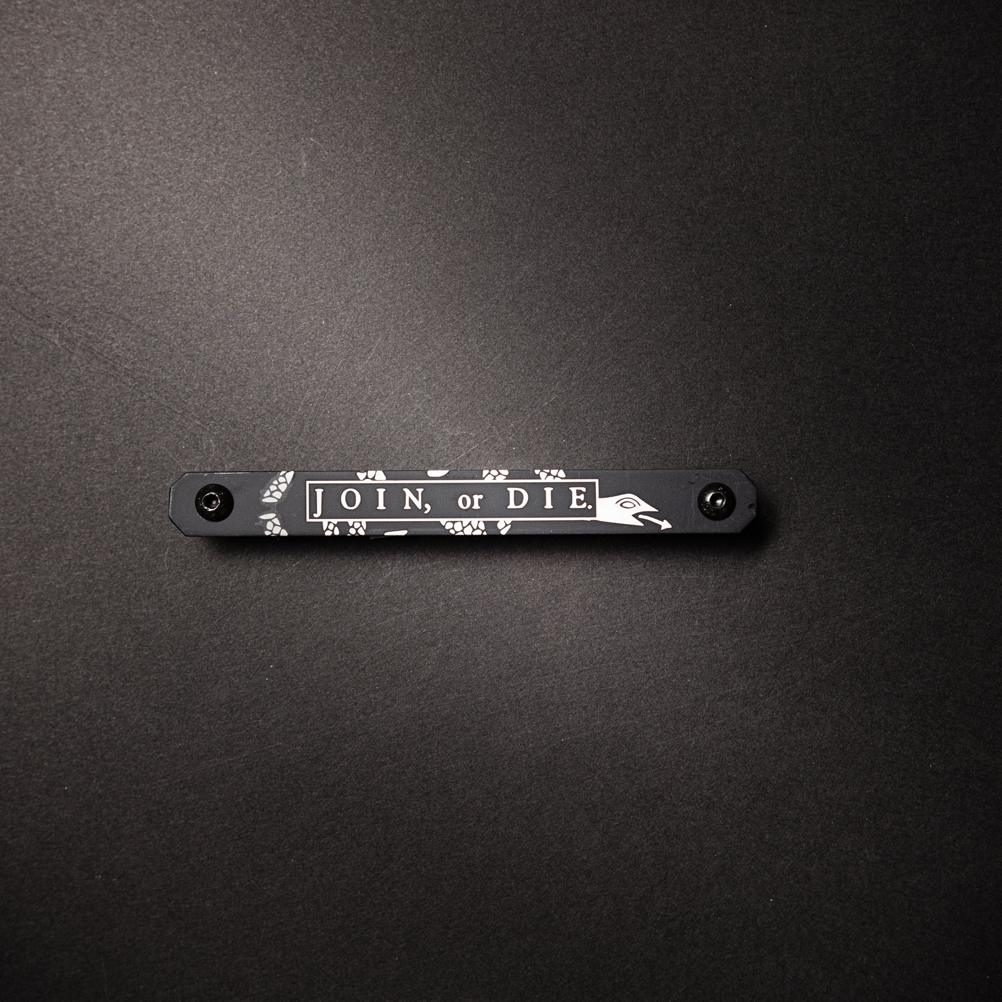 Boldly declare your stance with this "Join or Die" MLOK tag for your AR-15. Precision laser-engraved on premium Cerakoted aluminum, this handrail accessory isn't just for show—it's a statement. Designed for the fearless patriot who refuses to blend in, this custom tag transforms your standard rifle into a conversation-starting weapon of self-expression. Dare to stand out from the tactical crowd.